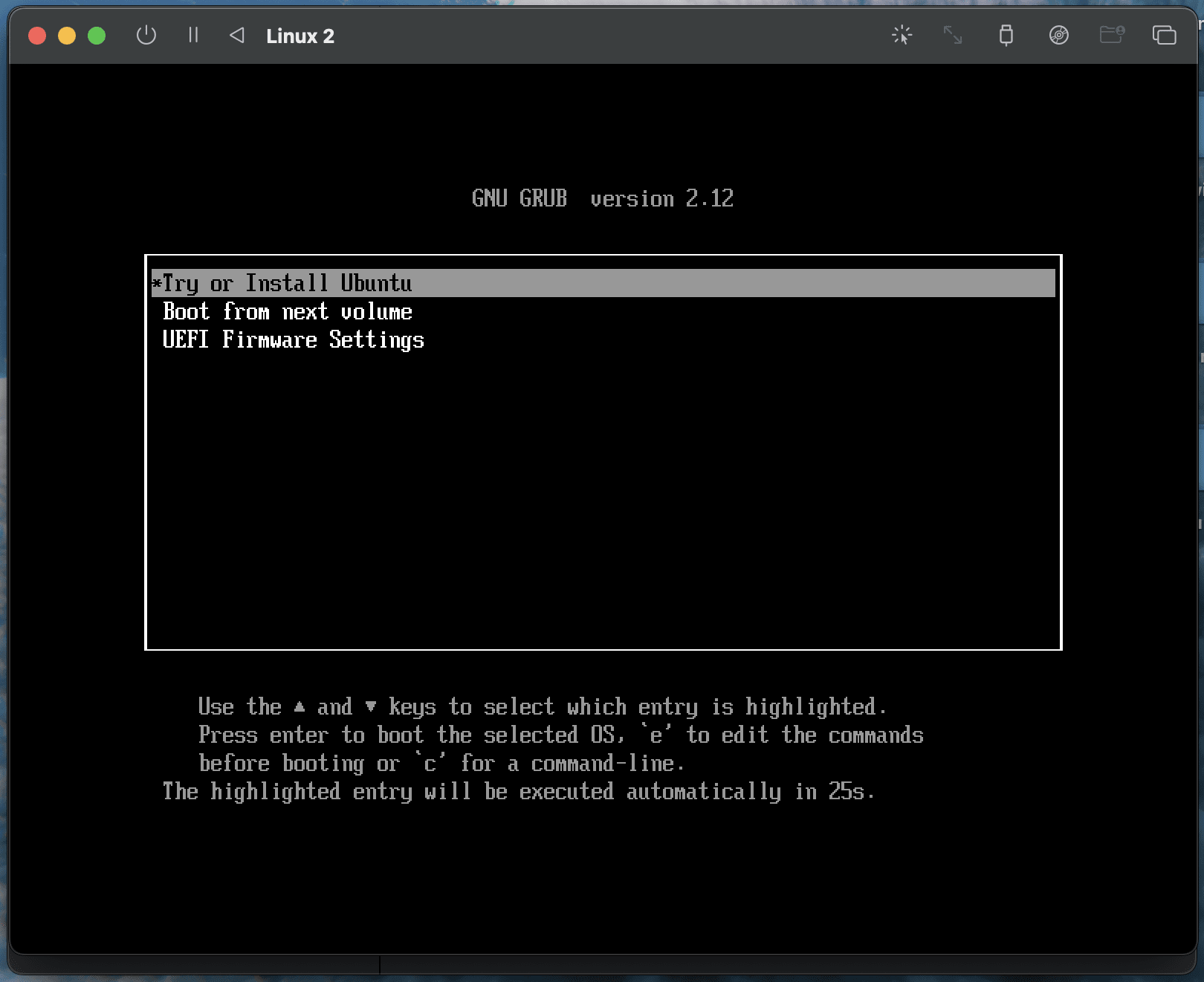 GRUB 메뉴에서 Try or Install Ubuntu를 선택하세요.